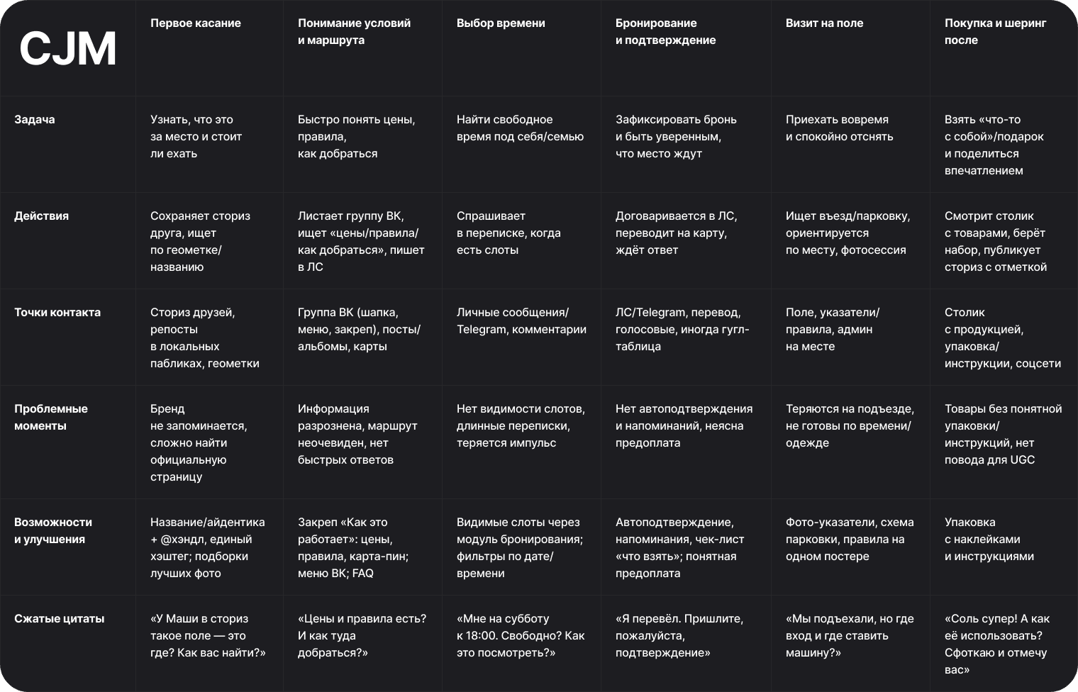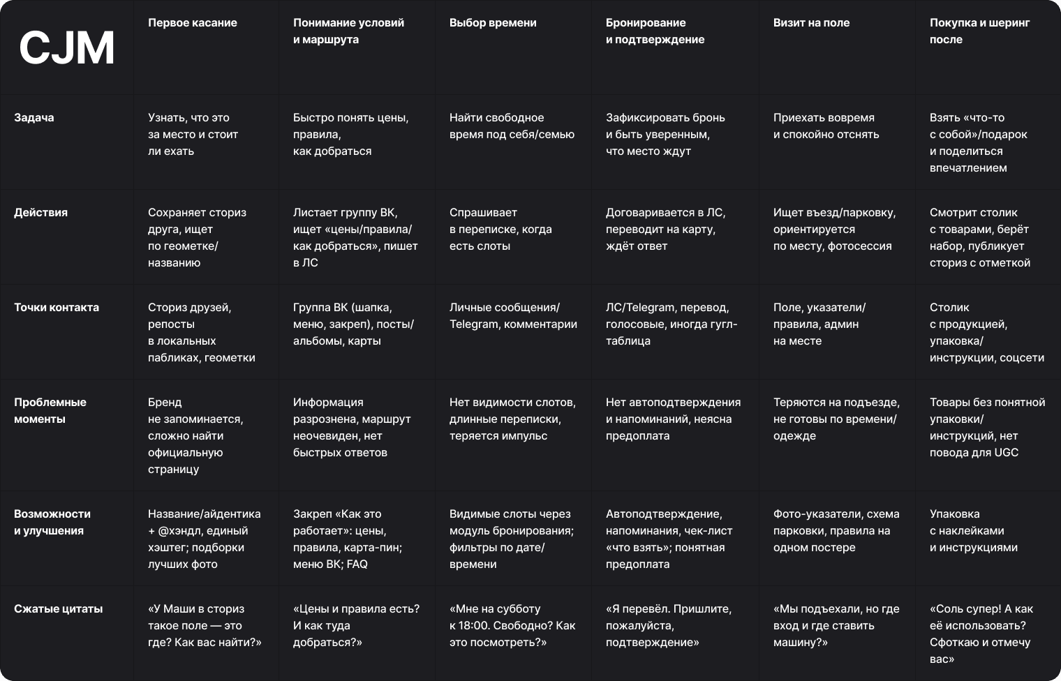 Провёл интервью с хозяйкой и клиентами, собрал CJM от момента «увидел фото поля» до «купил лаванду». Узкие места: договориться о времени (долгая переписка), неясный маршрут, неполное понимание ассортимента и цены. Триггеры: красивые референсы, отзывы друзей, готовые наборы «на подарок».