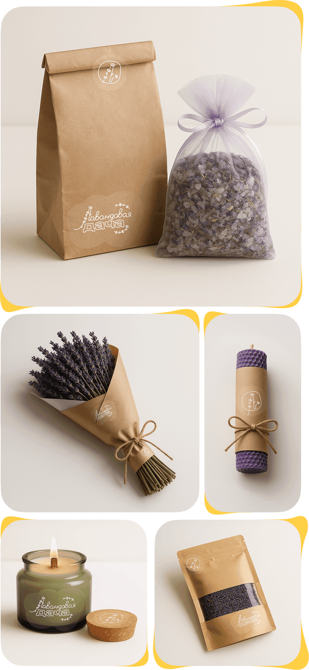 Чтобы передать уют и камерность места, выбрал название «Лавандовая дача». Разработал фирменный стиль, логотип и визуальную систему, подходящую для соцсетей, упаковки и сувениров.