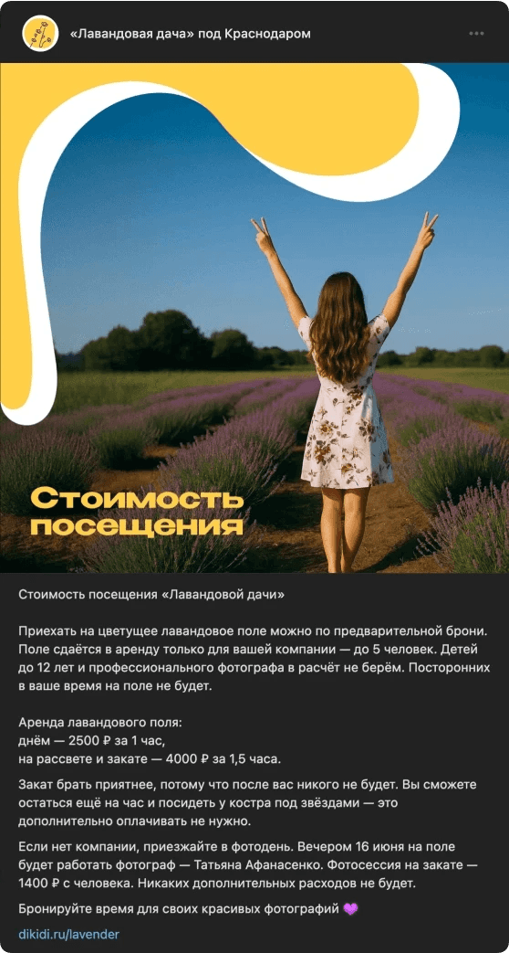 Редактор писала посты, исходя из реальных вопросов клиентов: как добраться, сколько стоит, что взять с собой. Это снижало количество личных запросов и помогало людям самостоятельно принять решение.